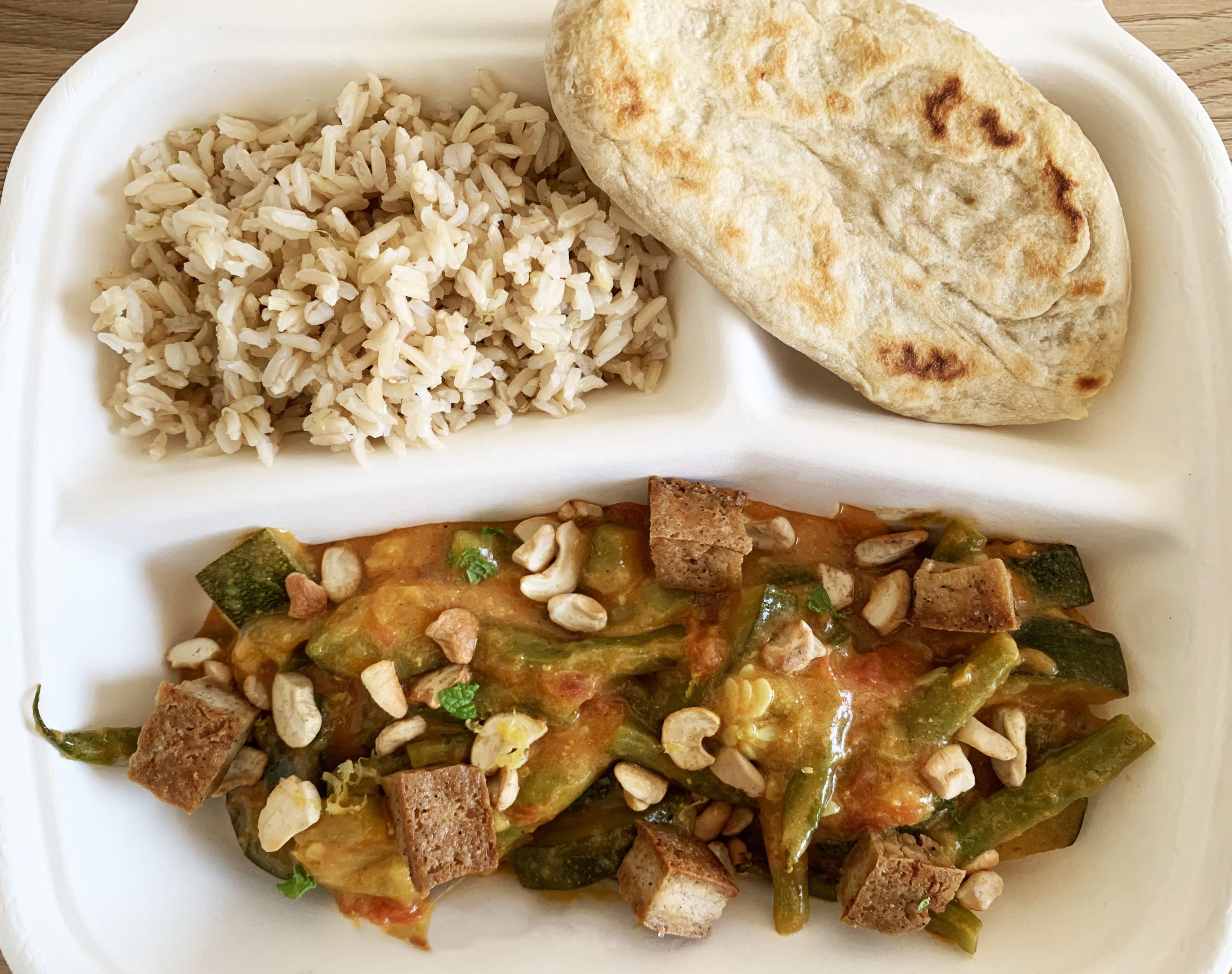 Deze curry verfrist je van binnen en geeft je een voldaan gevoel, zodat je echt lekker gegeten hebt. Geen suikerpieken meer voorlopig! Een romige curry van courgette en knapperige sperzieboontjes zwemmend in een heerlijke smaakvolle saus van kerrie-citroen-limoen- tomaat en kokosmelk. Extra fris door de verse gember en een zoetje door het venkelzaad. Zachte tofu en krokante cashewnootjes maken deze maaltijd af. Geserveerd met rijst en een zacht naan broodje.